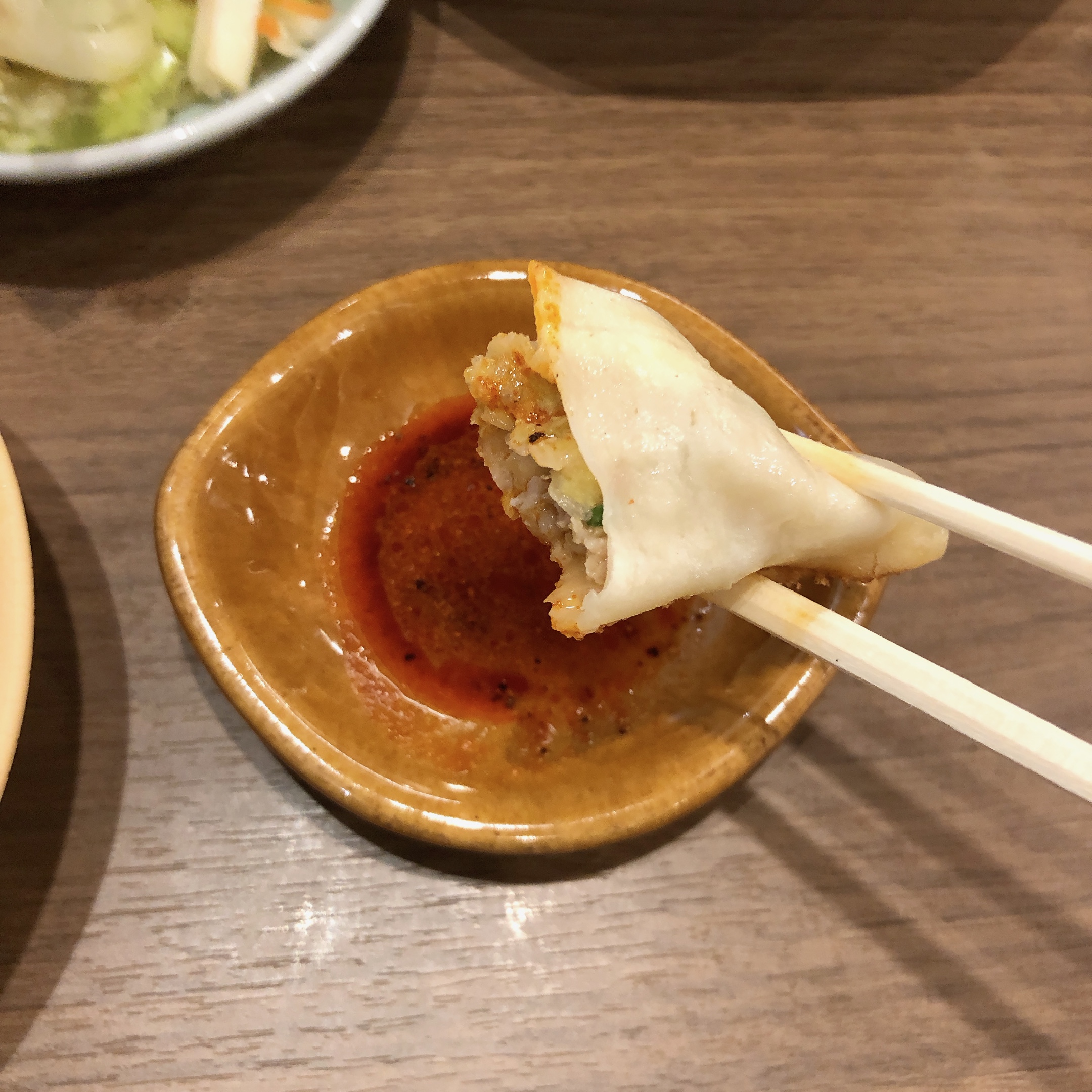저 물은 진짜 그냥 물이었다. 저기에 좋아하는 양념을 뿌려먹으래서 신기하게 물에 간장 식초 기름등을 뿌려서 휘휘 저어 먹었다. 일본 교자 많이 먹어봤지만 저런 스타일은 처음이었다. 희안함. 저 물의 맛은.. 간장 식초 기름 맛? (넣었으니까 당연해?) 물은 일단 제쳐두자. ㅋ 와... 이 만두는 쫄깃하지 않다. 뚈깃하다! 좋아!! 뚈깃뚈깃 해!