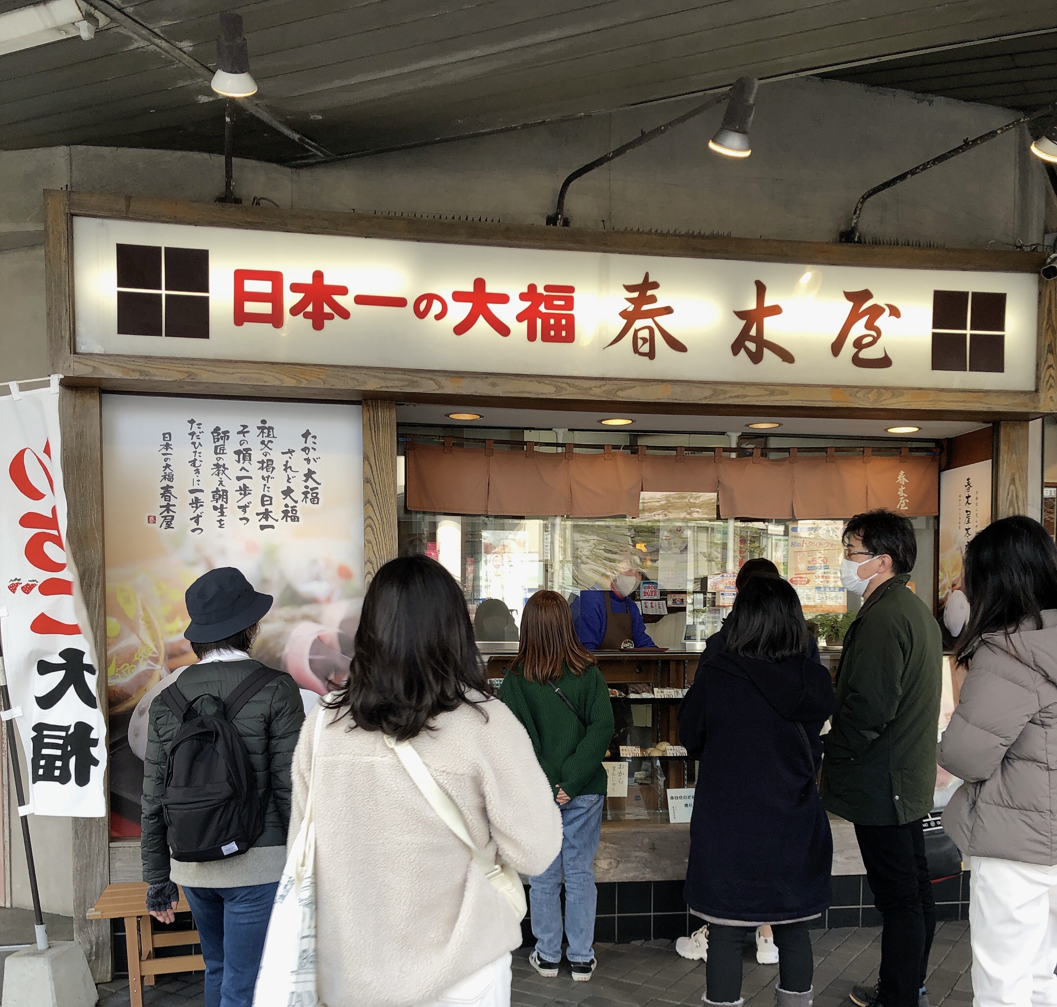 횡단보도 건너편에 '일본 제일의 다이후쿠'라고 쓰인 낡은 간판이 보였다. 그 앞에 손님들이 바글바글바글!!! 뭐라고 쓴 거야 저거..? 하루키... &? 마지막 글씨는 장기판에서나 볼 법한 한자라 ... 읽을 수 없지만 일단 줄 선다! 이런 건 집에 가기 전에 사 가자는 백프로 판단미스다. 나중에 앞머리를 치며 후회할 게 뻔하다.