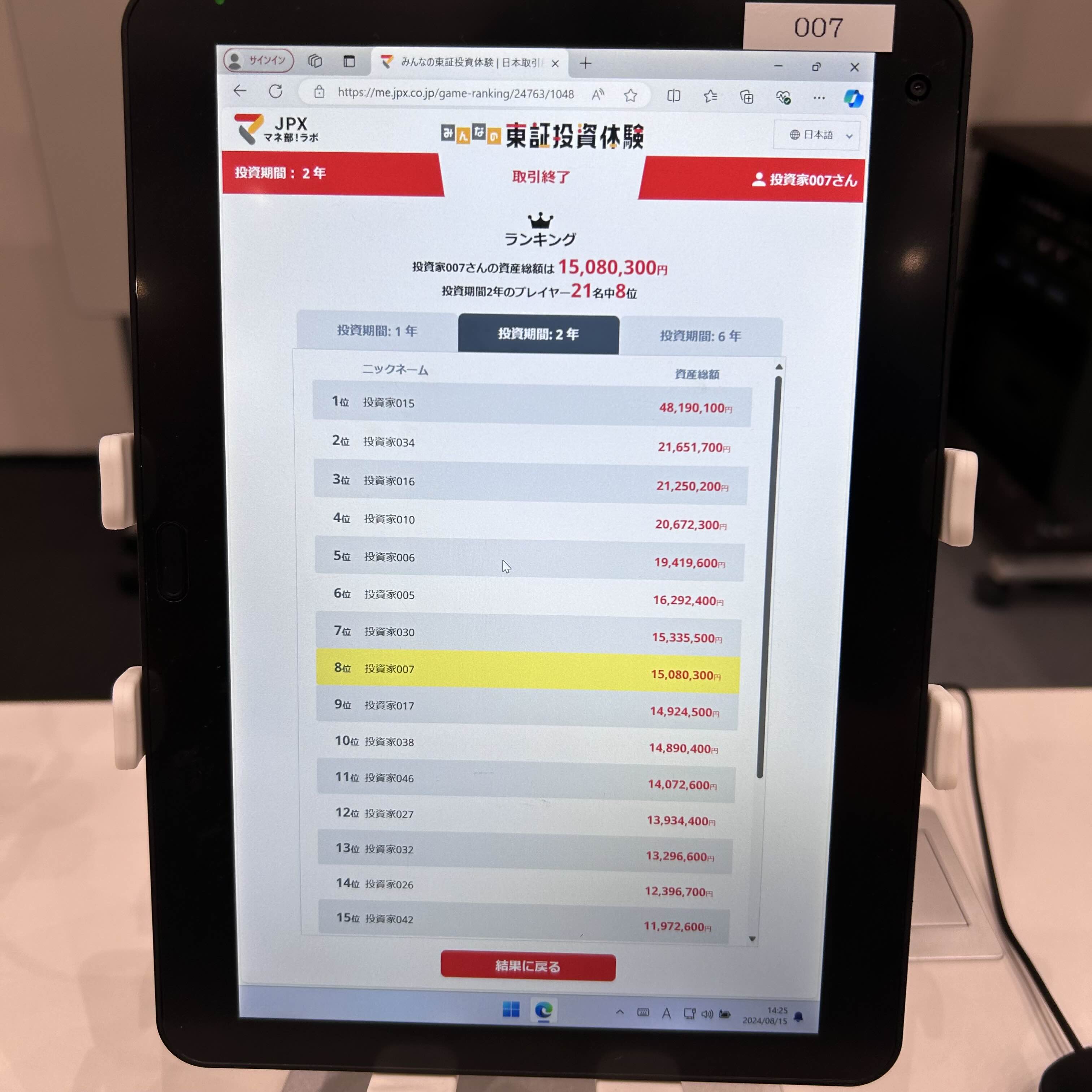 모든 자리에 태블릿이 있고 천만 엔의 가상 머니가 주어진다. 20분을 1년이라 설정하고 가상 뉴스를 토대로 자동차, 부동산, 제약회사 등 가상 회사에 투자를 하며 이윤을 남기는 게임이었다. 24명 정도 참가했는데