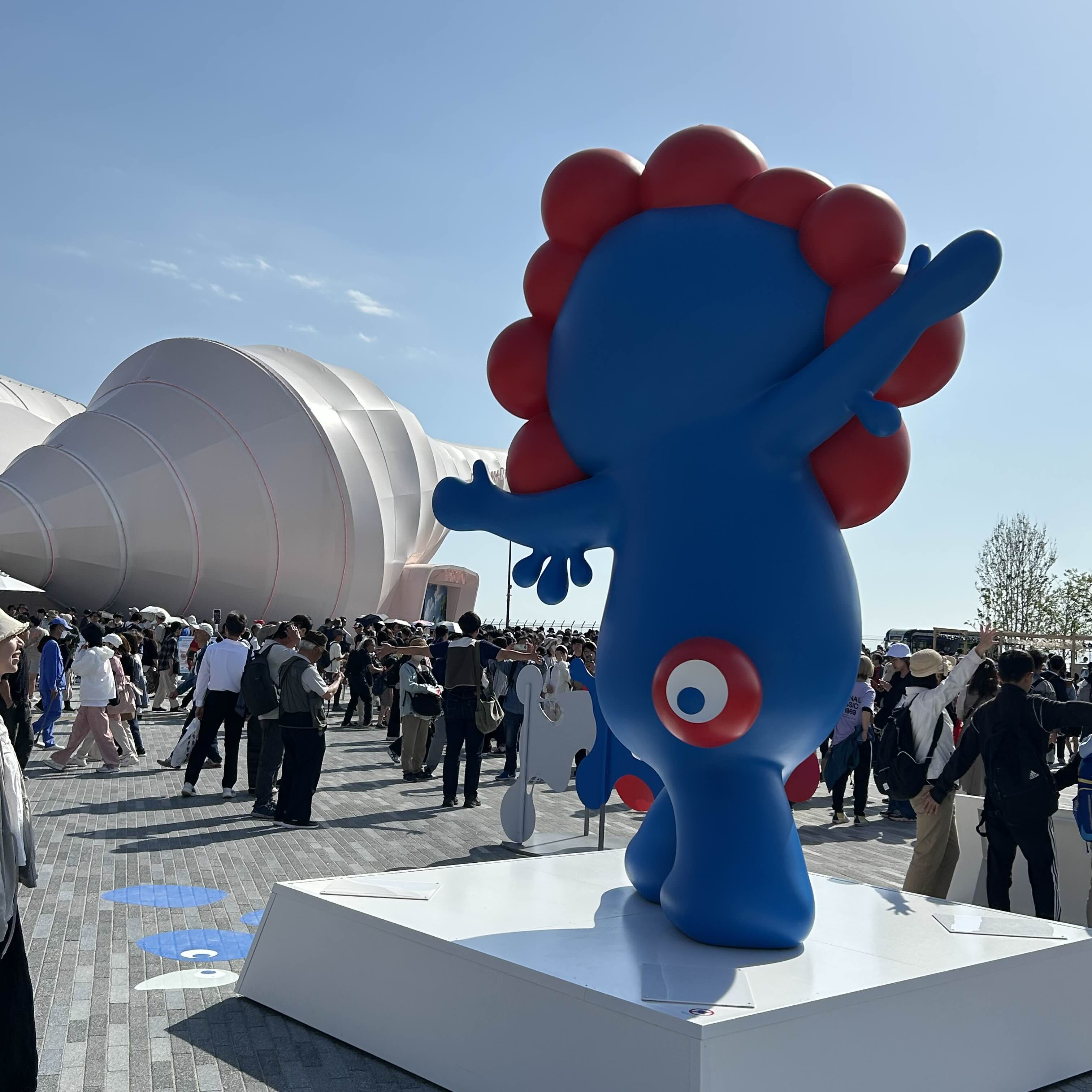 캐릭터 먀쿠먀쿠를 징그럽다고 하는 사람들도 많은데 얘는 정말 천재적이라고 생각한다. 저 징그러운 비주얼 한 번 보면 잊을 수가 없다. 덕분에 빨강 파랑이 믹스 된 무언가를 보면 바로 오사카 박람회를 떠올리게 만든다. 쟤는 빨간 부분이 세포고 파란 부분이 물이라서 고정된 형체를 가지고 있지 않고 아메바처럼 변형이 가능하다. 고양이로 변신한 모습도 있고 사람 모양으로 서 있을 때가 있고 사자 같은 애도 있다. 여러 버전으로 굿즈를 팔기에도 엄청난 잠재력을 가지고 있다는 이야기. 디자이너의 레퍼토리도 끝없이 나오기 쉽고 돈 벌기 쉽고 임팩트 쩔고. 뒤에 꼬리도 있었음.