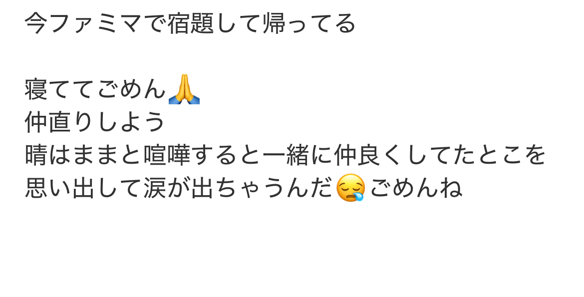하루가 자고 있는 집에 들어갔다. 집에서 재택근무한 케군이 하루는 어깨가 축 처져서 밥 먹고 양치하고 씻고 잤다고 말해줬다. 그날의 사건은 어떻게 풀었는지 잊어버렸지만 핸드폰에 다른 일로 화해했던 한 장의 사진을 발견했다.