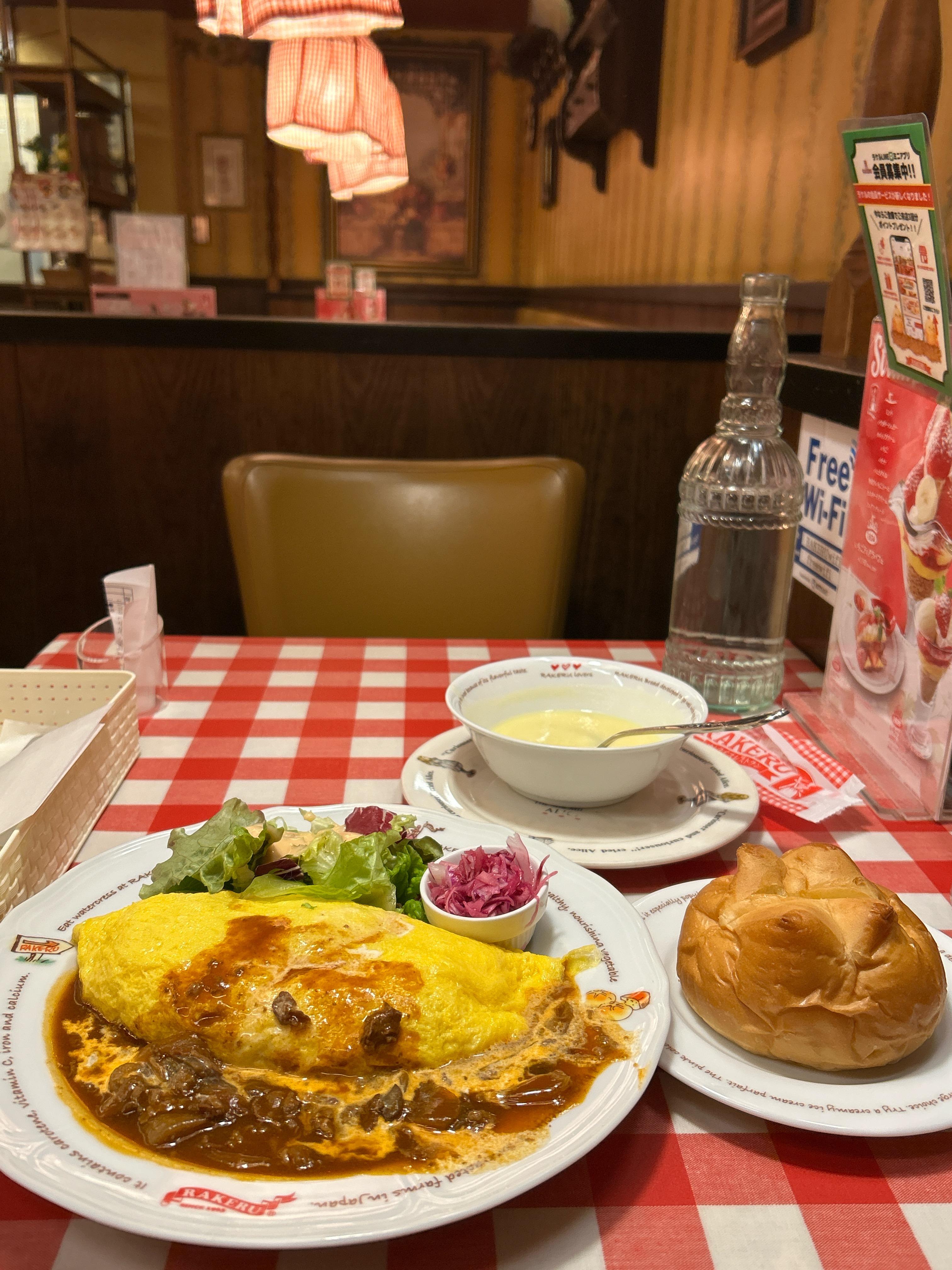 나의 빼이보릿 오므라이스 체인점 중 하나인 <RAKERU> 천지에 빨간 체크 무늬와 레이스가 가득한 인테리어가 좋아서 오는 사람들도 있을 것 같고 나처럼 오무라이스 종류가 많아서 오는 사람도 있을 것 같고 라케루의 간판과도 같은 뽀송한 빵 때문에 오는 사람도 있다. 버터 향이 가득하다. 그나저나 직원 유니폼이 이렇다.