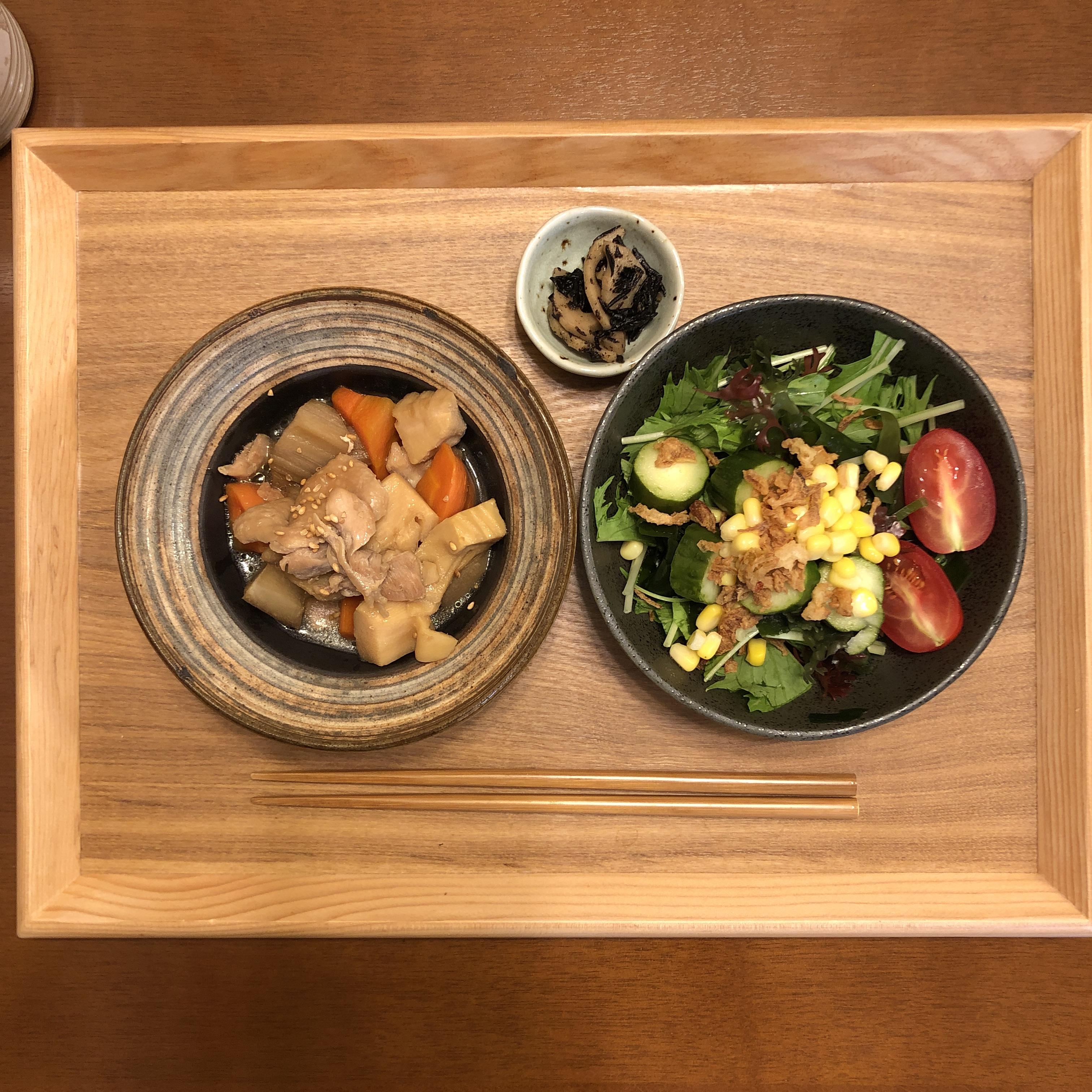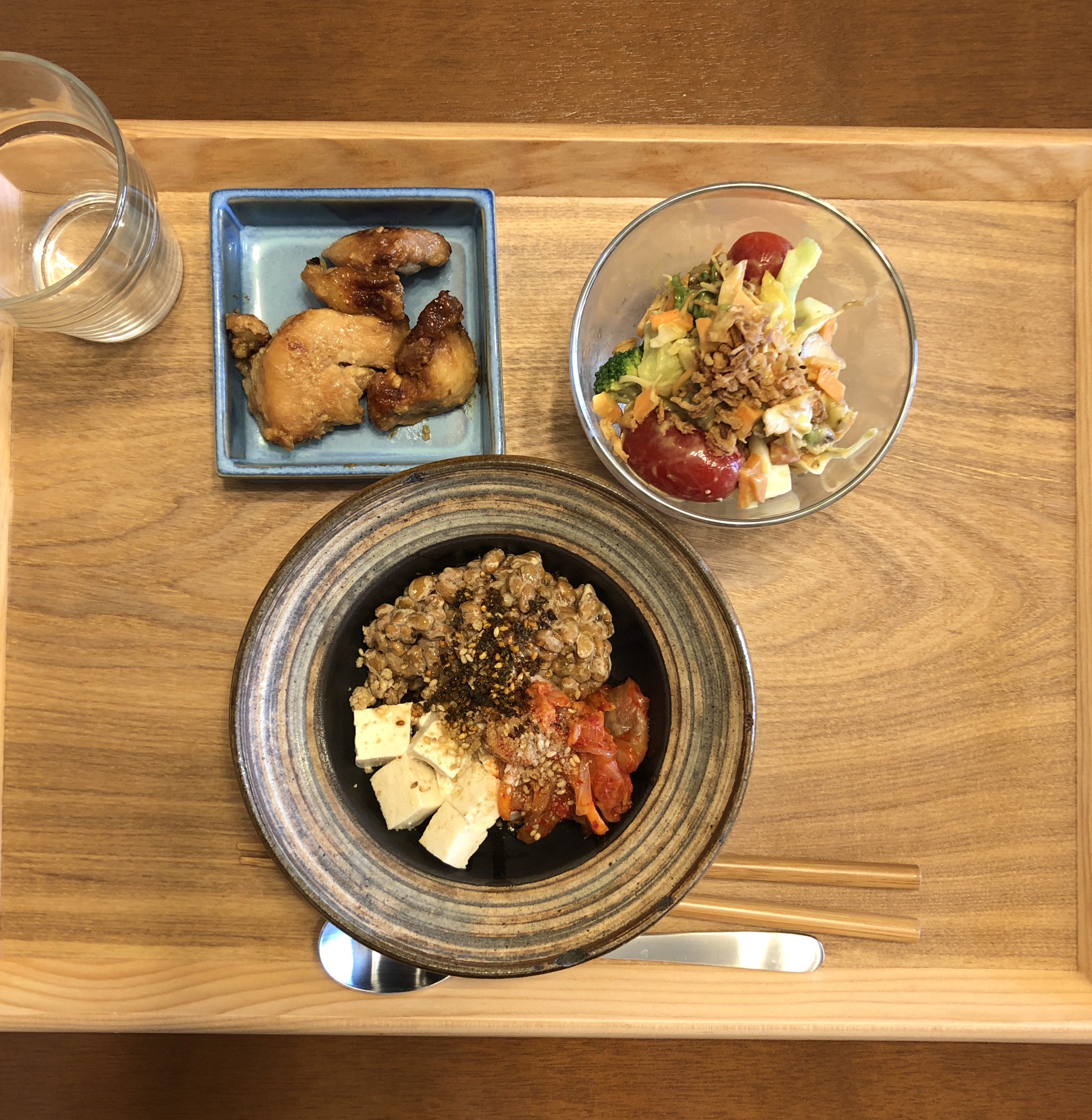 아점. 닭고기, 샐러드, 낫또두부.