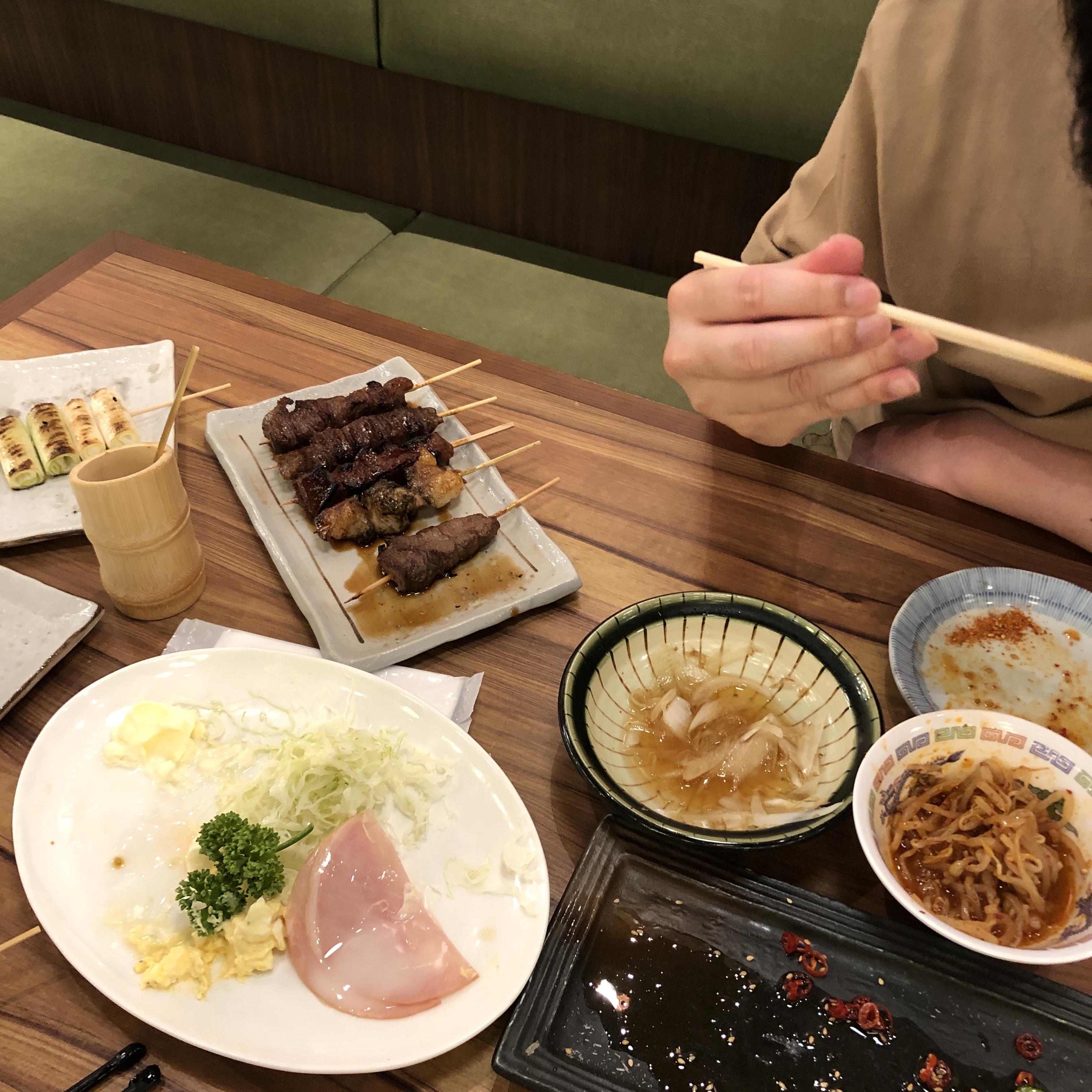 저녁은 이자카야. 샐러드, 닭꼬치, 닭껍질 튀김. 등등